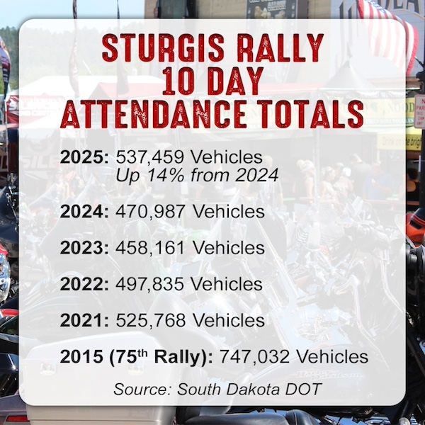 The DOT reported the 2024 Sturgis Rally attendance of 537,459 was up 14% from 2024.