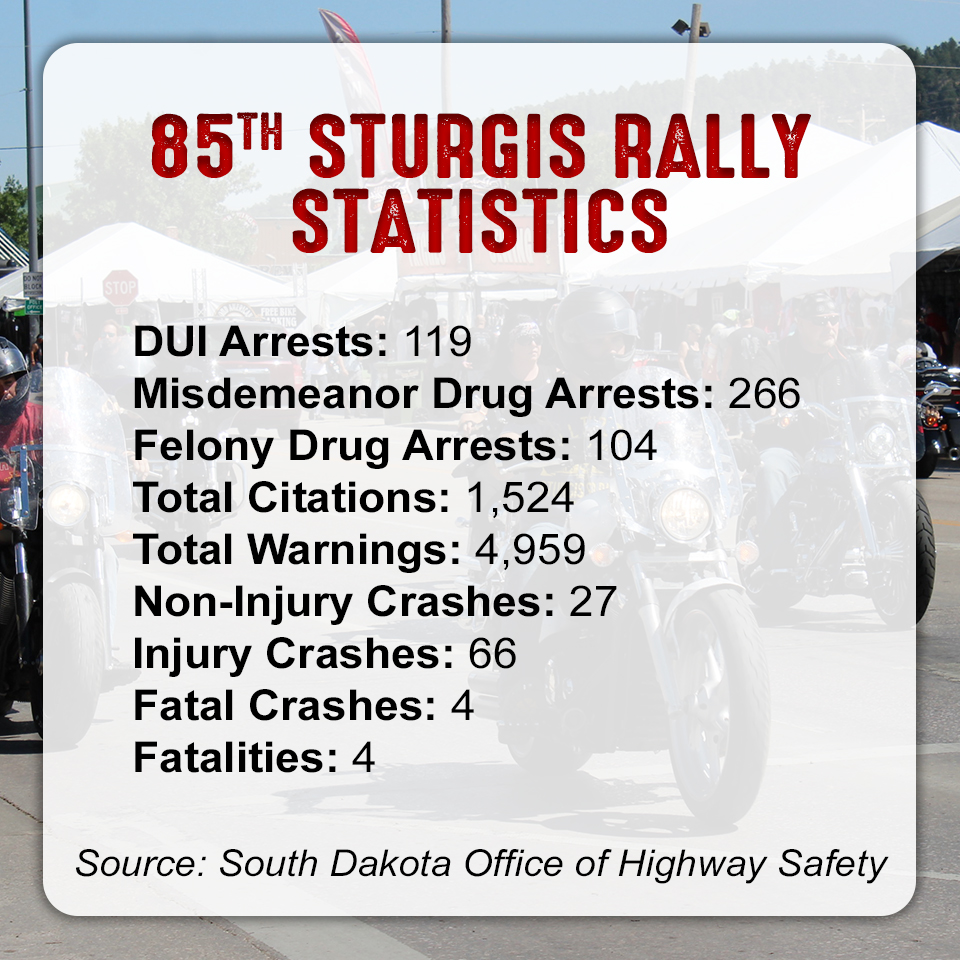 The South Dakota Office of Highway Safety reports that DUI arrests, misdemeanor drug arrests, felony drug arrests, and non-injury accidents were all down. Citations, warnings, injury crashes, and fatalities were all slightly up from 2024. See more rally statistics from the South Dakota Office of Highway Safety.